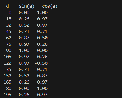 print(f'{d:3g} {a:5.2f} {math.sin(a):5.2f} {math.cos(a):5.2f}')